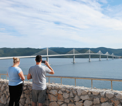 沿著克羅地亞狹長(zhǎng)的海岸線一路向南行駛到科馬爾納地區(qū),遠(yuǎn)遠(yuǎn)就能望見(jiàn)如銀鏈般橫臥在山海之間的佩列沙茨大橋。在橋頭一側(cè)的休息區(qū),人們紛紛停下車(chē)來(lái),對(duì)著大橋拍照留念。來(lái)自克羅地亞北部的卡塞爾和朋友們特地自駕來(lái)到這里,開(kāi)心地請(qǐng)本報(bào)記者幫忙合影?!芭辶猩炒拇髽蜻B通了克羅地亞南北領(lǐng)土,是我們心中最美的大橋!”卡塞爾說(shuō)。