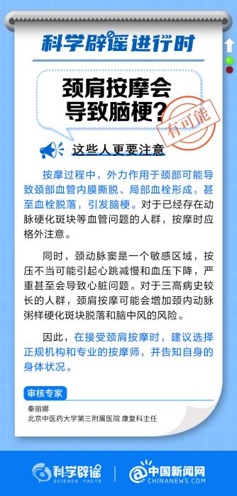中新網(wǎng)10月12日電 按摩過程中,外力作用于頸部可能導(dǎo)致頸部血管內(nèi)膜撕脫、局部血栓形成,甚至血栓脫落,引發(fā)腦梗。在接受頸肩按摩時,建議選擇正規(guī)機(jī)構(gòu)和專業(yè)的按摩師,并告知自身的身體狀況。(來源:@科學(xué)辟謠 @中國新聞網(wǎng) )