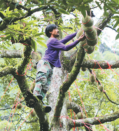 猜瓦家的果園在山坳里,記者乘車從春蓬府直轄縣駛出30公里后,從省際公路拐入狹窄的山間道路,行駛半個小時后才來到果園,一大片榴蓮樹分布在斜坡上?!傲裆徬菜荒蜐?,所以斜坡上最好,這里距離海邊不遠(yuǎn),保證了濕潤的氣候,山里的土壤營養(yǎng)成分高,所以種植的榴蓮肉質(zhì)上乘。”猜瓦興致勃勃地介紹起自家的果園。