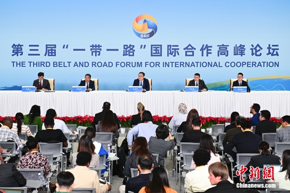 10月16日,第三屆“一帶一路”國際合作高峰論壇新聞中心在位于北京的國家會(huì)議中心舉行首場(chǎng)吹風(fēng)會(huì),邀請(qǐng)自然資源部國際合作司和相關(guān)單位負(fù)責(zé)人介紹有關(guān)情況,并回答記者提問。圖為吹風(fēng)會(huì)現(xiàn)場(chǎng)?!≈行律缬浾?田雨昊 攝