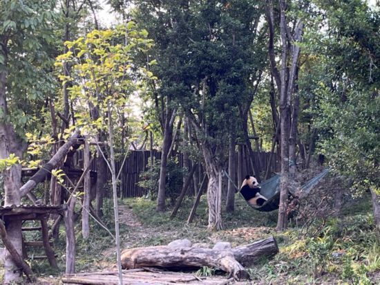圖說:10月21日,四川成都大熊貓繁育研究基地,一只大熊貓在悠閑進食。