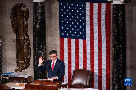10月25日,在美國(guó)華盛頓國(guó)會(huì),新當(dāng)選的眾議院議長(zhǎng)邁克·約翰遜宣誓就職。新華社發(fā)(亞倫攝)
