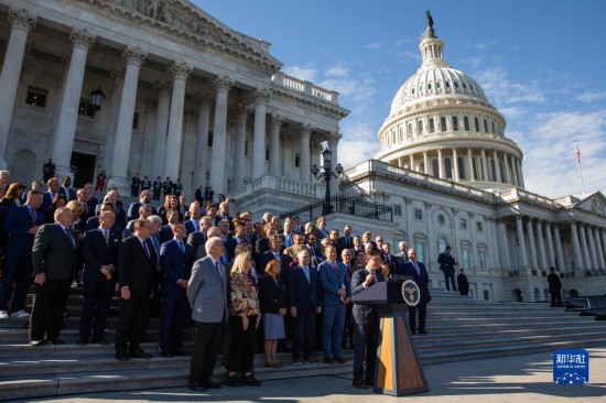 10月25日,在美國(guó)華盛頓國(guó)會(huì),新當(dāng)選的眾議院議長(zhǎng)邁克·約翰遜(后右)發(fā)表講話。新華社發(fā)(亞倫攝)