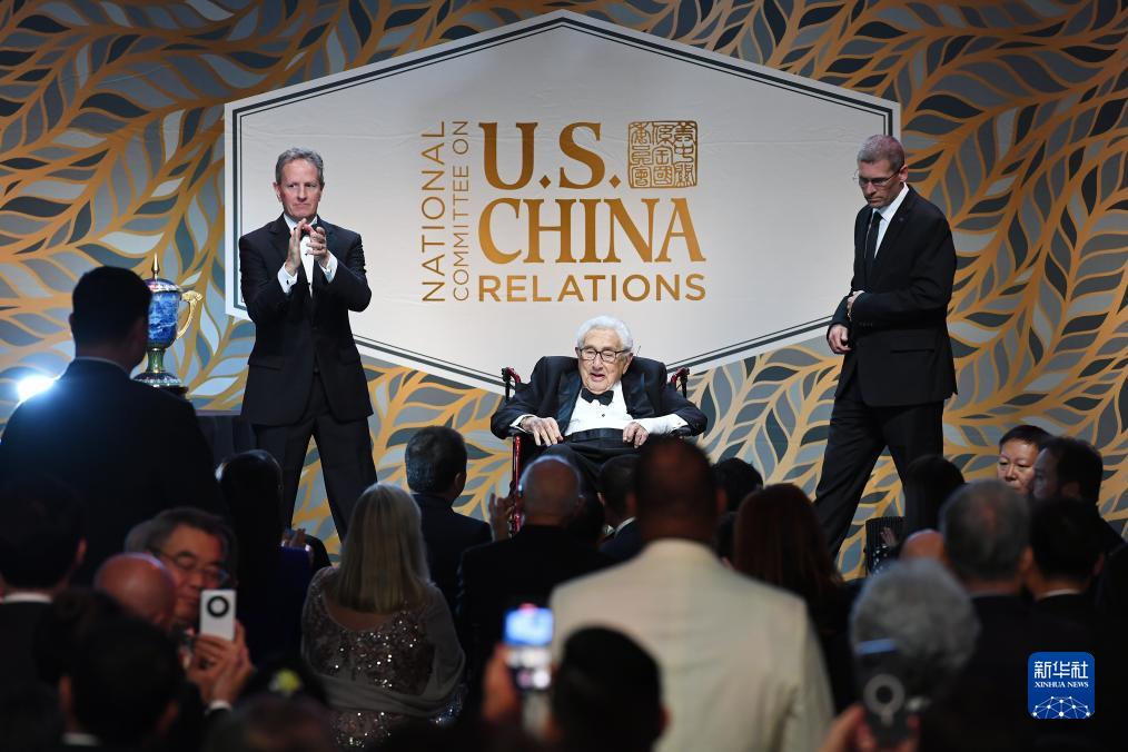 10月24日,美國(guó)前國(guó)務(wù)卿基辛格(中)出席在紐約舉行的美中關(guān)系全國(guó)委員會(huì)年度頒獎(jiǎng)晚宴。新華社記者 李睿 攝
