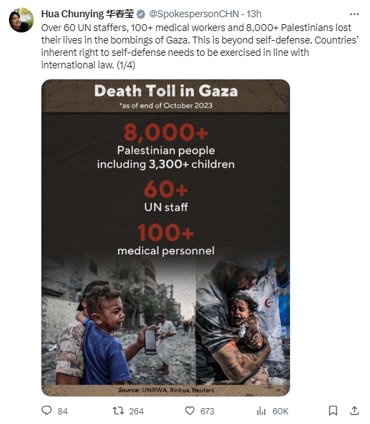 據(jù)報道,當天,華春瑩發(fā)帖提及加沙地帶的人員傷亡。她稱,“超過60名聯(lián)合國工作人員、100名醫(yī)務(wù)工作者、8000名巴勒斯坦人在對加沙的轟炸中喪生。這超出了自衛(wèi)的范圍。各國擁有的自衛(wèi)權(quán)須依據(jù)國際法行使。”