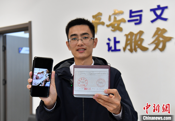 圖為新生兒父親展示帶有133100數(shù)字的戶口頁。 中新社記者 韓冰 攝