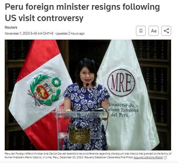 報(bào)道稱,外界質(zhì)疑赫瓦西在處理秘魯總統(tǒng)博盧阿特上周訪美時(shí)的表現(xiàn),這可能也是赫瓦西宣布辭職的原因。