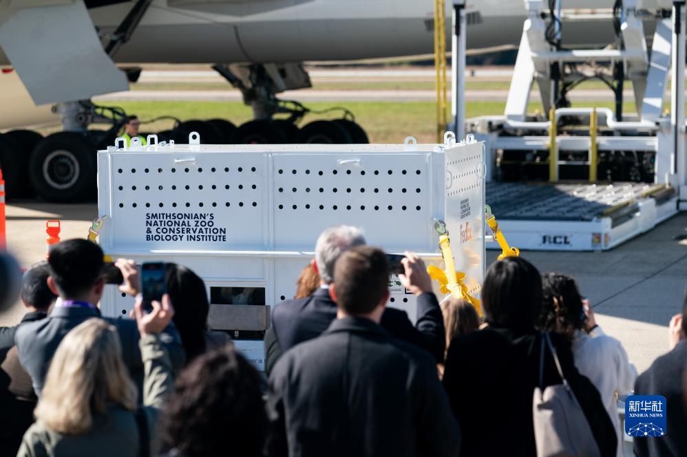 11月8日,在美國弗吉尼亞州的華盛頓杜勒斯國際機(jī)場(chǎng),裝有大熊貓的特制“旅行包廂”準(zhǔn)備運(yùn)上專機(jī)。新華社記者劉杰攝