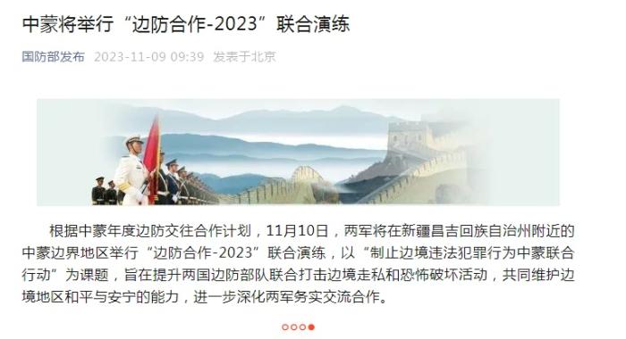 中新網(wǎng)11月9日電 據(jù)國(guó)防部發(fā)布微信公眾號(hào)消息,根據(jù)中蒙年度邊防交往合作計(jì)劃,11月10日,兩軍將在新疆昌吉回族自治州附近的中蒙邊界地區(qū)舉行“邊防合作-2023”聯(lián)合演練,以“制止邊境違法犯罪行為中蒙聯(lián)合行動(dòng)”為課題,旨在提升兩國(guó)邊防部隊(duì)聯(lián)合打擊邊境走私和恐怖破壞活動(dòng),共同維護(hù)邊境地區(qū)和平與安寧的能力,進(jìn)一步深化兩軍務(wù)實(shí)交流合作。