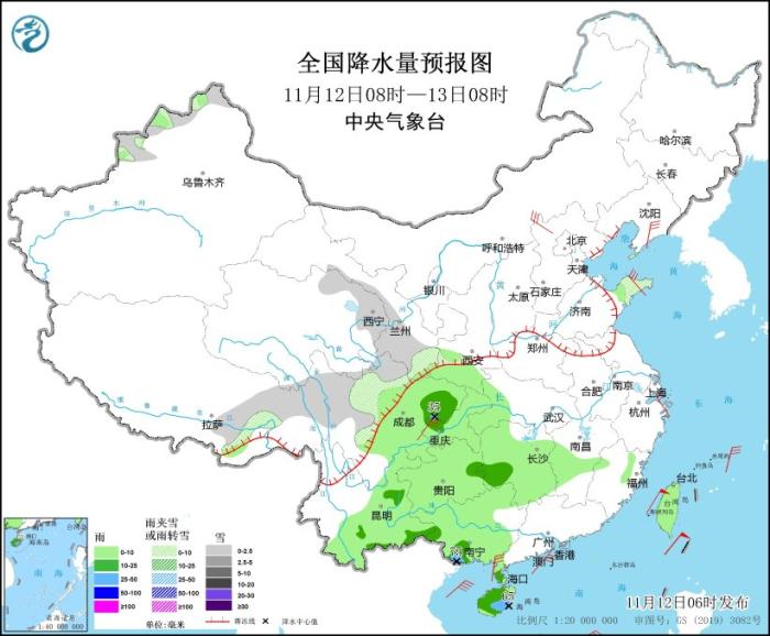 11月12日08時至13日08時,新疆北疆北部和伊犁河谷、西藏東部、青海南部和東部、川西高原北部、甘肅中南部等地部分地區(qū)有小雪或雨夾雪。四川盆地、貴州東部、湖南西部、云南南部和東部、廣西南部、雷州半島、海南島等地部分地區(qū)有中到大雨,其中,廣西南部、海南島東部局地有暴雨(50~75毫米)。內(nèi)蒙古中東部、遼東半島、河北北部、山東半島、四川盆地、浙江東部、雷州半島等地部分地區(qū)有5~6級風(fēng)。東海大部、臺灣海峽、臺灣以東洋面、巴士海峽、南海北部和中部、北部灣將有7~8級、陣風(fēng)9級的大風(fēng)。
