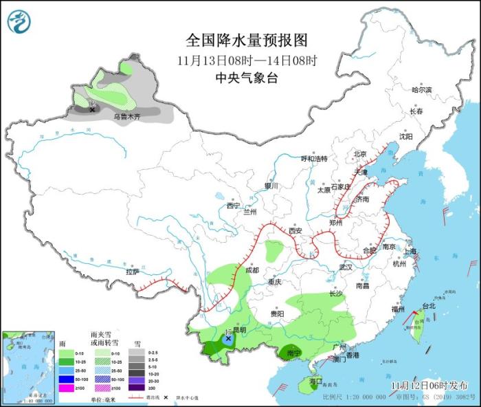 11月13日08時至14日08時,新疆北部等地部分地區(qū)有小到中雪或雨夾雪,局地大到暴雪(10~12毫米)。湖南南部、四川盆地、貴州南部和東部、云南大部、廣西、廣東北部、海南島、臺灣島等地部分地區(qū)有小到中雨,其中,云南中部局地有大雨(25~45毫米)。東海南部、臺灣海峽、臺灣以東洋面、巴士海峽、南海北部和中部、北部灣、瓊州海峽將有7~8級、陣風(fēng)9級的大風(fēng)。