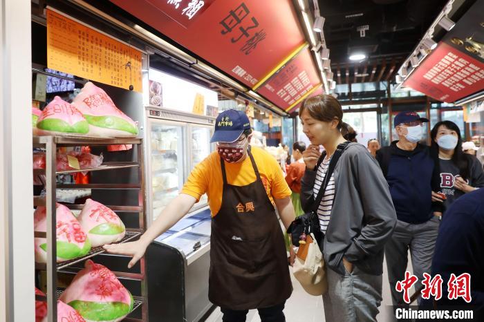 正式開張首日,各攤商早早地布置好店面。記者在市場(chǎng)一樓看到,立家湖州粽店的粽子等美食香氣四溢,購買民眾排起長(zhǎng)隊(duì);合興糕團(tuán)店的巨大壽桃上有“?!薄暗摗薄吧湛鞓贰钡茸郑櫩团恼?;大連食品店整齊擺著各類堅(jiān)果,并掛著湖南臘腸、廣東臘肉等熟食。