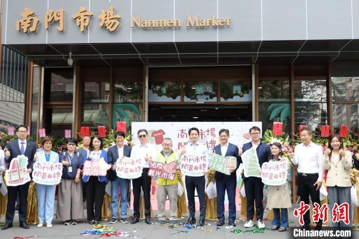 11月16日,經(jīng)過四年改建的臺(tái)北南門市場(chǎng)正式重新開業(yè),圖為出席開幕式的嘉賓剪彩后合影?!≈行律缬浾?陳小愿 攝