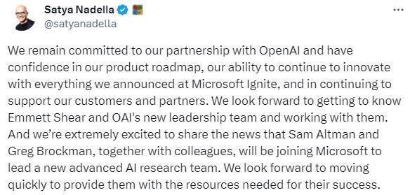 據(jù)路透社20日?qǐng)?bào)道,微軟CEO納德拉在社交媒體上發(fā)文稱,微軟仍然致力于與OpenAI的合作,并期待了解希爾領(lǐng)導(dǎo)的新團(tuán)隊(duì)。同時(shí)納德拉宣布,阿爾特曼、OpenAI前總裁格雷格·布羅克曼及其同事將加入微軟,領(lǐng)導(dǎo)一個(gè)新的高級(jí)人工智能研究團(tuán)隊(duì)。微軟期待著迅速采取行動(dòng),為其成功提供所需的資源。