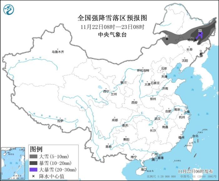 暴雪黃色預(yù)警:預(yù)計,11月22日08時至11月23日08時,內(nèi)蒙古東部、黑龍江中東部、吉林北部和長白山區(qū)等地的部分地區(qū)有大到暴雪,其中,黑龍江中部局地有大暴雪(20~22毫米);上述地區(qū)新增積雪深度6~12厘米,局地可達(dá)16厘米以上。