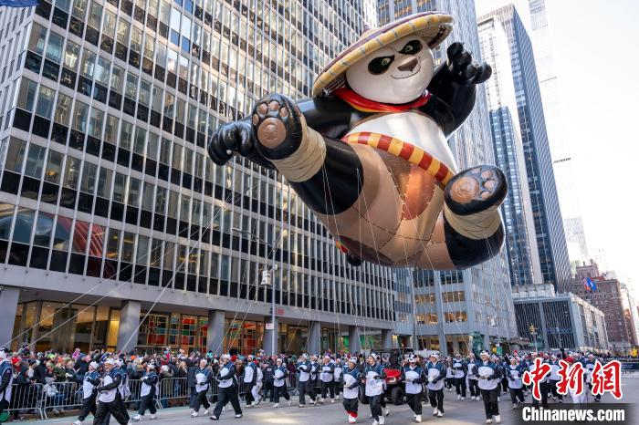 當(dāng)?shù)貢r(shí)間11月23日,第97屆梅西百貨感恩節(jié)大游行在美國(guó)紐約曼哈頓舉行。圖為基于動(dòng)畫(huà)電影《功夫熊貓》里阿寶的造型設(shè)計(jì)的巨型氣球行進(jìn)在曼哈頓街頭。 中新社記者 王帆 攝