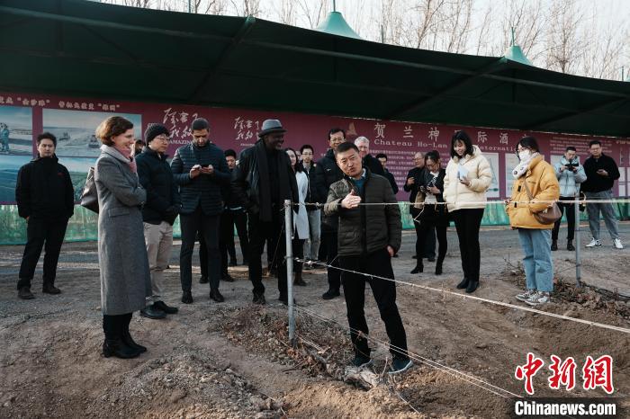 駐華使節(jié)、外交官和外國地方駐華機(jī)構(gòu)代表在賀蘭神酒莊了解葡萄藤埋土工作?!≈行戮W(wǎng)記者 崔楠 攝