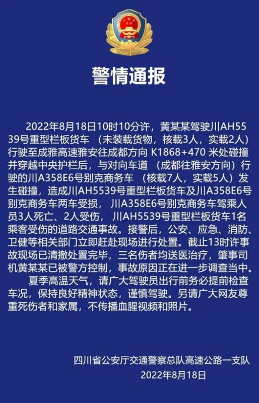 2022年8月18日10時10分許,G5京昆高速公路成雅段K1868公里+150米路段(成都市蒲江縣境內)發(fā)生川 AH55**貨車沖斷中央護欄與對向正常行駛的川A35***小客車發(fā)生碰撞,造成小客車內3人當場死亡,小客車內2人和大貨車內1人受傷、2車及高速公路路產受損的道路交通事故,直接經(jīng)濟損失約350萬元。
