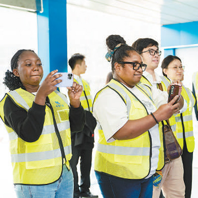 2023“一帶一路”媒體合作論壇聯(lián)合采訪團(tuán)成員參觀中國建筑長沙機(jī)場T3航站樓項(xiàng)目。