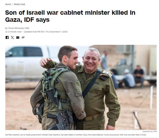 中新網(wǎng)12月8日電 綜合外媒報(bào)道,當(dāng)?shù)貢r(shí)間7日,以色列國(guó)防軍表示,以色列內(nèi)閣部長(zhǎng)、前國(guó)防軍參謀長(zhǎng)加迪·埃曾科特的兒子在加沙地帶北部的戰(zhàn)斗中喪生。