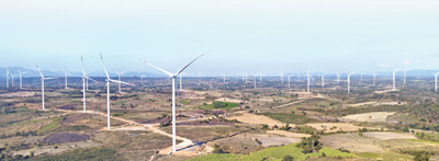 在越南中南部嘉萊省公則若縣縣城以西,數(shù)十座巨型風力發(fā)電機的葉片徐徐轉(zhuǎn)動,為當?shù)厣a(chǎn)生活供應源源不斷的電力。