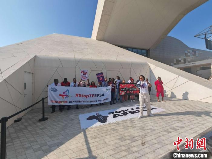 12月10日,阿聯(lián)酋迪拜,來自非洲的抗議者在COP28期間呼吁保護(hù)海洋環(huán)境、應(yīng)對氣候變化,反對在非洲使用化石燃料?!≈行律缬浾?龐無忌 攝