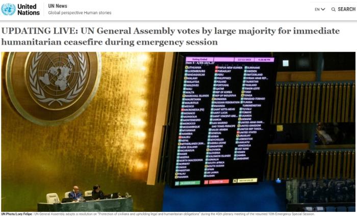 聯(lián)合國(guó)大會(huì)高票通過加沙停火決議 美國(guó)投票反對(duì)