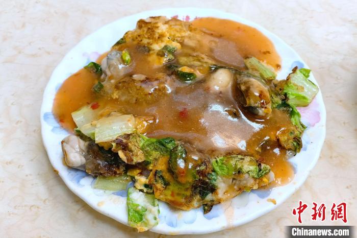 近日,臺北寧夏夜市里圓環(huán)邊蚵仔煎店的蚵仔煎?!≈行律缬浾?陳小愿 攝