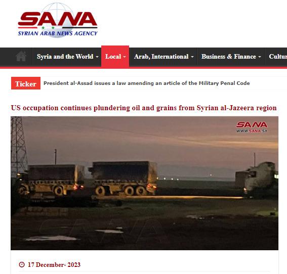 報道還稱,這是“美國在敘非法駐軍掠奪敘利亞國家財富系統(tǒng)性計劃的一部分”。