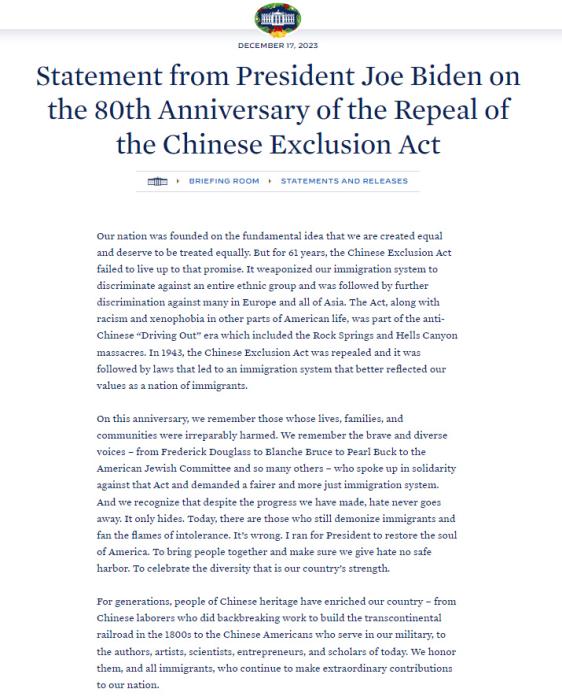 據白宮網站消息,拜登在文告中指出,“人人生而平等,應該受到平等對待。但61年來,排華法案未能兌現這一承諾。它將我們的移民制度武器化,歧視整個種族群體,隨后又進一步歧視歐洲和整個亞洲的許多人?!?/p>