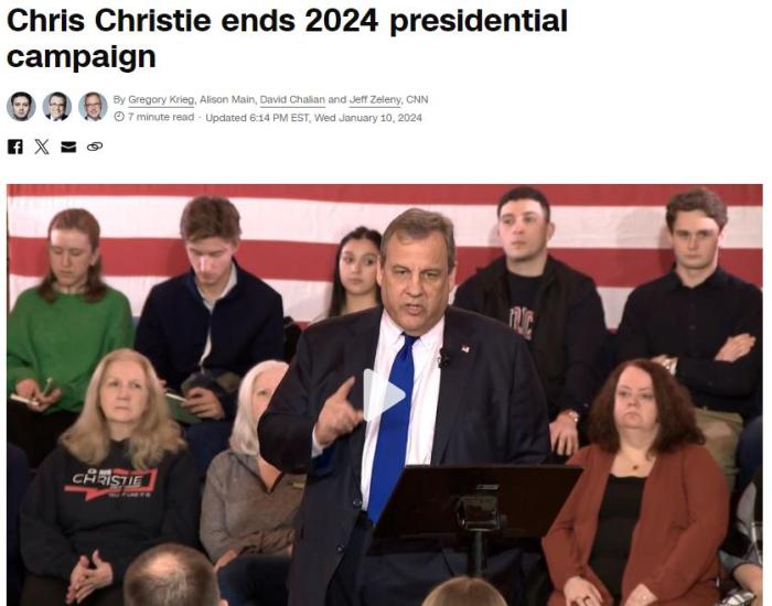 中新網(wǎng)1月11日電 綜合外媒報(bào)道,美國(guó)前新澤西州州長(zhǎng)克里斯蒂(Chris Christie)當(dāng)?shù)貢r(shí)間10日宣布結(jié)束2024年美國(guó)總統(tǒng)競(jìng)選。盡管克里斯蒂作為初選“戰(zhàn)場(chǎng)”上前總統(tǒng)特朗普的主要批評(píng)者而備受關(guān)注,但他并未能在民調(diào)中獲得廣泛支持。