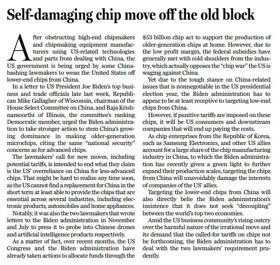 美國部分國會議員近期再次炒作中國芯片安全威脅,其行動可以說是“理智不多但傷害性不小”,加上所謂追加關(guān)稅的要求,更是在美國企業(yè)界激起極大反對之聲。與中國“脫鉤斷鏈”最終只會得不償失,究竟如何應對,奉勸拜登政府還是審慎而行。