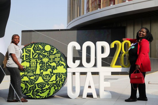 2023年12月3日,人們?cè)诼?lián)合國氣候變化迪拜大會(huì)“綠區(qū)”的大會(huì)標(biāo)識(shí)旁合影。新華社記者王東震攝