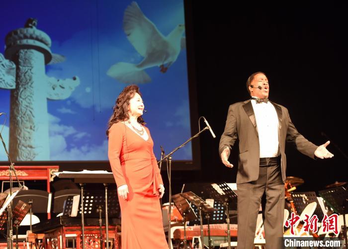 當(dāng)?shù)貢r(shí)間1月27日晚,以紀(jì)念中美建交45周年為主題的鷹飛龍騰新年音樂(lè)會(huì)在美國(guó)洛杉磯唱響。圖為中美兩國(guó)歌唱家聯(lián)袂演唱《我愛(ài)你中國(guó)》?!≈行律缬浾?張朔 攝
