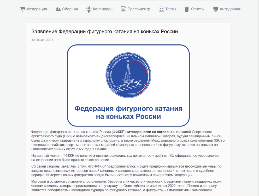 當(dāng)?shù)貢r間1月30日,俄羅斯花樣滑冰聯(lián)合會(FFKKR)發(fā)布聲明表示,團(tuán)隊中運(yùn)動員的誠信無可挑剔,“堅決不同意國際體育仲裁法庭對卡米拉·瓦利耶娃的處罰”。
