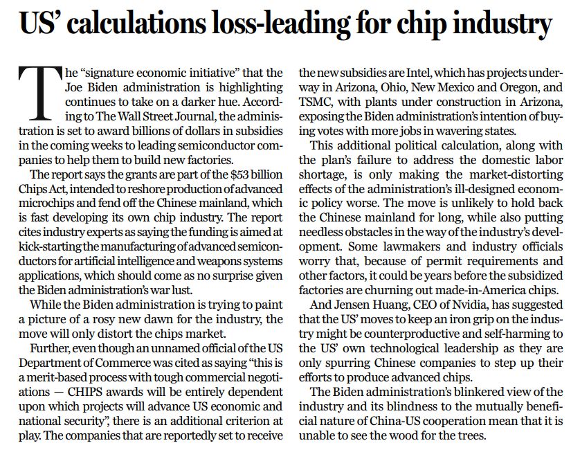拜登政府此前出臺的《芯片法案》,可為芯片企業(yè)提供總計(jì)530億美元的補(bǔ)貼,用以鼓勵先進(jìn)芯片制造產(chǎn)業(yè)向美國國內(nèi)回流,同時遏制正在快速發(fā)展自主半導(dǎo)體產(chǎn)業(yè)的中國大陸?!度A爾街日報》稱,上述建廠補(bǔ)貼,屬于《芯片法案》的一部分。報道還援引行業(yè)專家的觀點(diǎn)表示,這筆資金將為用于人工智能及武器系統(tǒng)的先進(jìn)半導(dǎo)體的生產(chǎn)提供啟動資金,而基于拜登政府對戰(zhàn)爭的狂熱,此舉不足為奇。