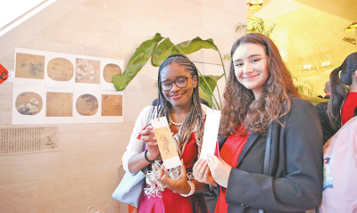 圖為在文化體驗(yàn)展臺(tái),兩名美國(guó)學(xué)生展示自己用毛筆繪制的書簽。