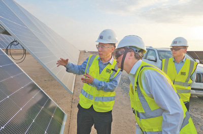 中企承建的沙特阿爾舒巴赫光伏電站是在建的全球最大單體光伏電站。圖為工作人員介紹電站情況。