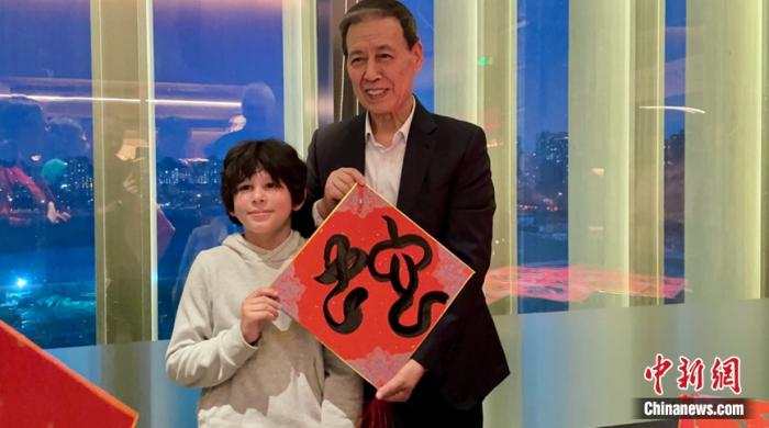 中國書法家修先臺(tái)先生向法國小男孩贈(zèng)送書法作品。中新網(wǎng)黃方攝