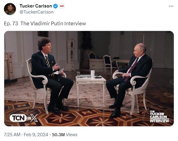 上線前,這場采訪就在世界范圍內(nèi)引發(fā)關注。有媒體稱,這次采訪或?qū)⒊蔀?022年烏克蘭危機爆發(fā)后,美國媒體人對普京進行的首個正式訪問。相關通告已在社交媒體上獲得了網(wǎng)友的上億次瀏覽量。