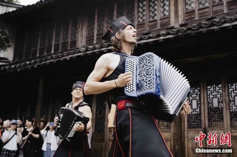 圖為國外藝術(shù)家在會昌戲劇小鎮(zhèn)中表演。圖源:會場戲劇小鎮(zhèn)公眾號
