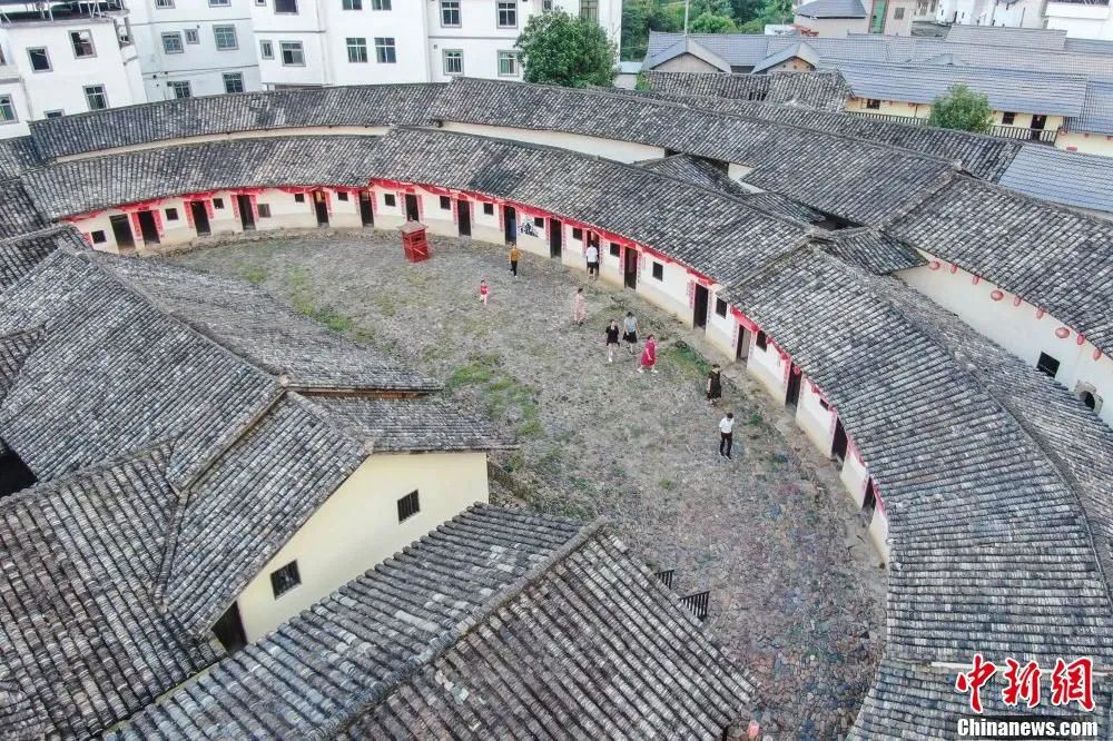 航拍尋烏縣角背圍龍屋,游客在屋內(nèi)游覽。劉力鑫 攝
