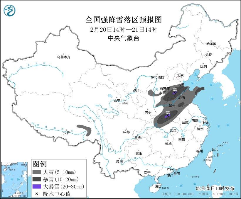 中新網(wǎng)2月20日電 據(jù)中央氣象臺網(wǎng)站消息,預(yù)計2月20日14時至2月21日14時,陜西北部、山西東南部、河北南部、山東、河南、安徽北部、湖北西部、西藏東部等地部分地區(qū)有大到暴雪,其中,河北南部、河南南部等地局地有大暴雪(20~22毫米)。上述部分地區(qū)新增積雪深度3~8厘米,局地可達12厘米以上。