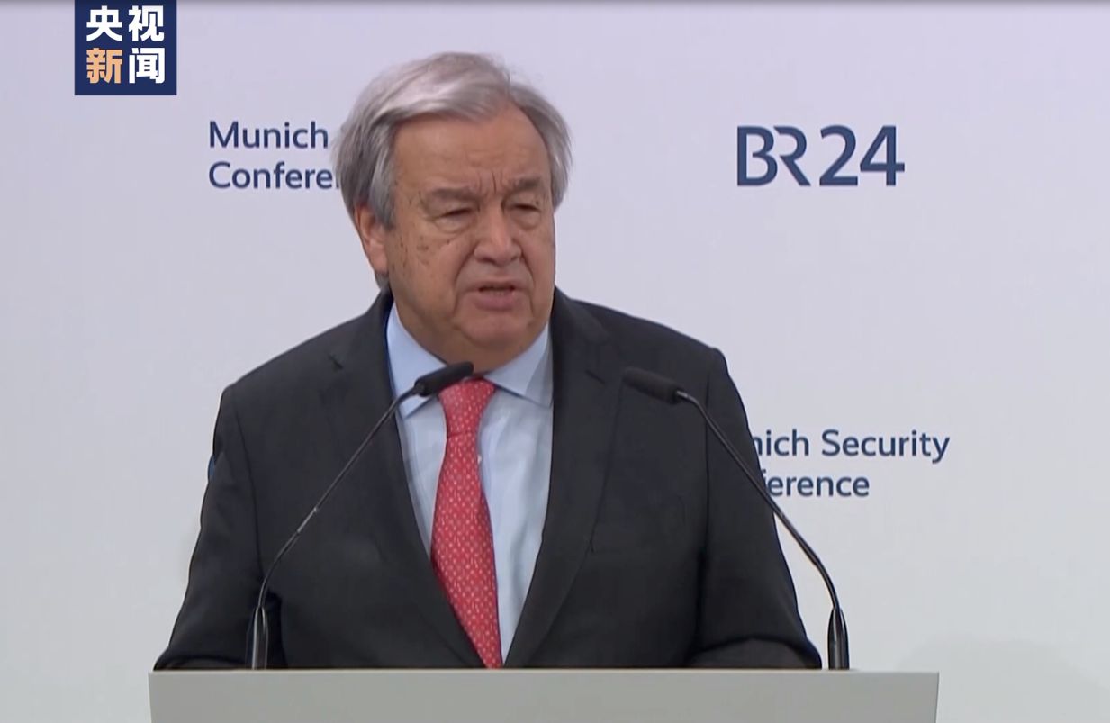 △2月16日,聯(lián)合國秘書長古特雷斯在慕安會(huì)上發(fā)表開幕致辭(圖由總臺(tái)記者拍攝)