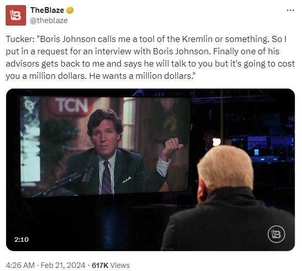 中新網(wǎng)2月21日電 綜合外媒消息,近日,美國記者卡爾森在接受美國新聞網(wǎng)站“TheBlaze”的采訪時透露,他此前曾試圖采訪英國前首相約翰遜,但約翰遜要卡爾森支付100萬美元才同意接受采訪。