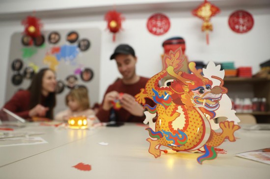 2月24日,人們?cè)诒壤麜r(shí)班什舉行的“金龍迎新——2024比利時(shí)生肖設(shè)計(jì)展”期間體驗(yàn)制作龍形燈籠。(新華社記者趙丁喆攝)