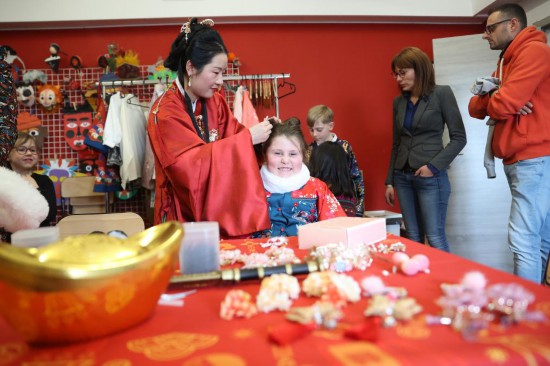 2月24日,小朋友在比利時(shí)班什舉行的“金龍迎新——2024比利時(shí)生肖設(shè)計(jì)展”期間體驗(yàn)漢服妝造。(新華社記者趙丁喆攝)