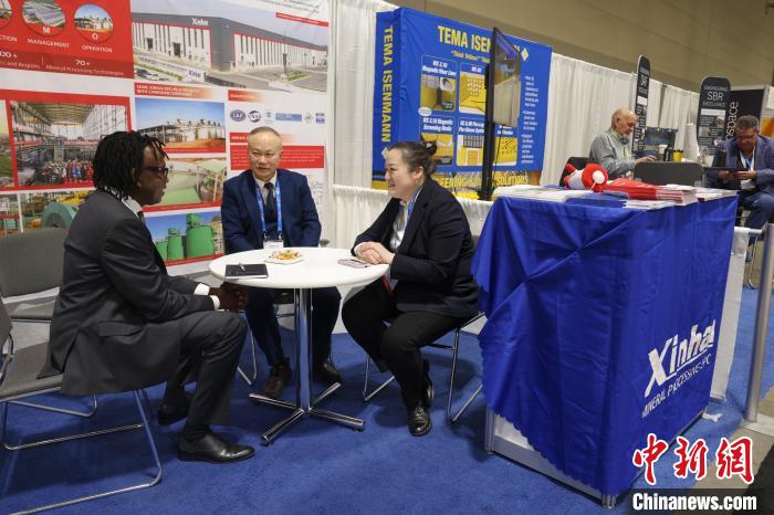 當(dāng)?shù)貢r(shí)間3月3日,2024年加拿大國際礦業(yè)大會(huì)(PDAC)在多倫多揭幕。圖為中國企業(yè)山東鑫海礦業(yè)技術(shù)裝備股份有限公司參展代表與客商洽談。中新社記者 余瑞冬 攝