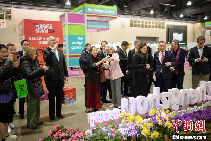 當(dāng)?shù)貢r(shí)間3月2日,一年一度的費(fèi)城花展在美國(guó)賓夕法尼亞州費(fèi)城開(kāi)幕,以“功夫鄭州——花俏嵩山”為主題的鄭州展園當(dāng)天在花展上亮相。圖為中國(guó)駐紐約總領(lǐng)事黃屏(右三)帶領(lǐng)嘉賓參觀鄭州展園。 Franck Zhou 攝