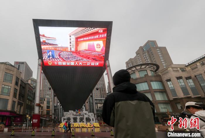 3月5日,十四屆全國(guó)人大二次會(huì)議在北京人民大會(huì)堂開幕。圖為北京一戶外大屏播放開幕會(huì)?!≈行律缬浾?賈天勇 攝